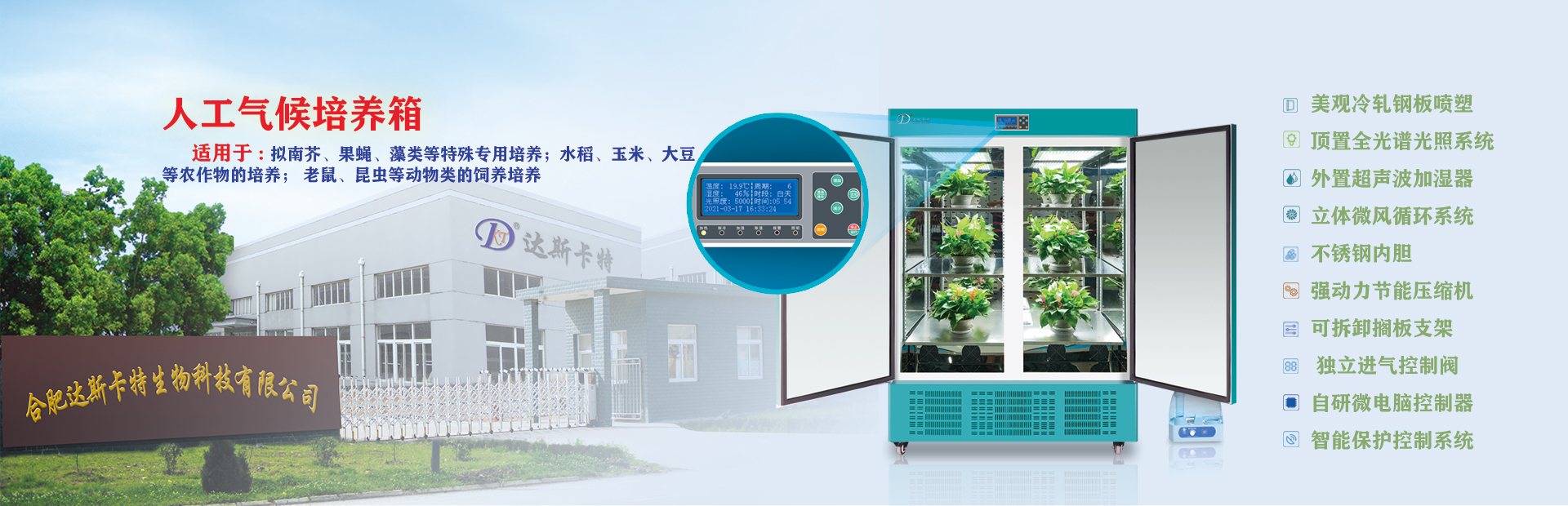 合肥達(dá)斯卡特生物科技有限公司前身是合肥華德利科學(xué)器材有限公司,擁有自足品牌“達(dá)斯卡特”。本公司是專業(yè)研發(fā)、生產(chǎn)制造、技術(shù)服務(wù)及市場營銷為一體的實業(yè)公司。公司自主研發(fā)的各類規(guī)格的干燥箱系列、恒溫箱系列、生化培養(yǎng)箱系列、光照培養(yǎng)箱系列、人工氣候箱系列、恒溫恒濕箱系列、二氧化碳人工氣候箱系列、低溫培養(yǎng)箱系列、超低溫保存箱系列、搖床系列、人工氣候室、植物生長室、冷庫、潔凈室等實驗室儀器設(shè)備及工程項目,特別是實驗室箱體類的產(chǎn)品目前擁有二十八大類、五十多個品種、八十多個規(guī)格、近三百多個型號。